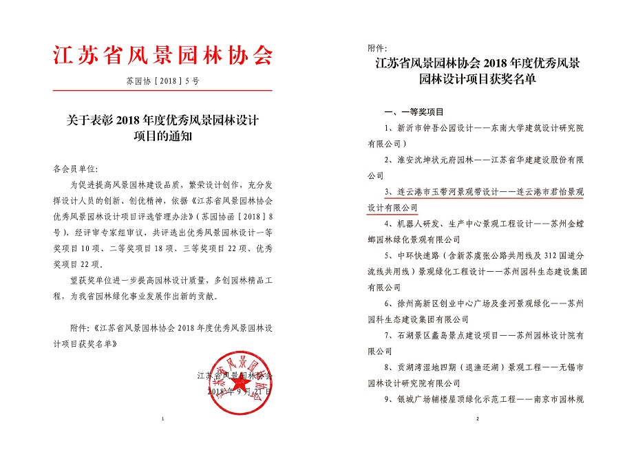 1018日喜訊,近日江蘇省風(fēng)景園林協(xié)會(huì)發(fā)布《關(guān)于表彰2018年度優(yōu)秀風(fēng)景園林設(shè)計(jì)項(xiàng)目的通知》,我司景觀設(shè)計(jì)項(xiàng)目連云港市玉帶河景觀帶設(shè)計(jì)榮獲2018年度省優(yōu)秀風(fēng)景園林設(shè)計(jì)項(xiàng)目一等獎(jiǎng)。同時(shí)秦山島旅游規(guī)劃景觀設(shè)計(jì)榮獲省三等獎(jiǎng),贛榆和安湖濕地公園景觀設(shè)計(jì)榮獲省優(yōu)秀項(xiàng)目獎(jiǎng)。